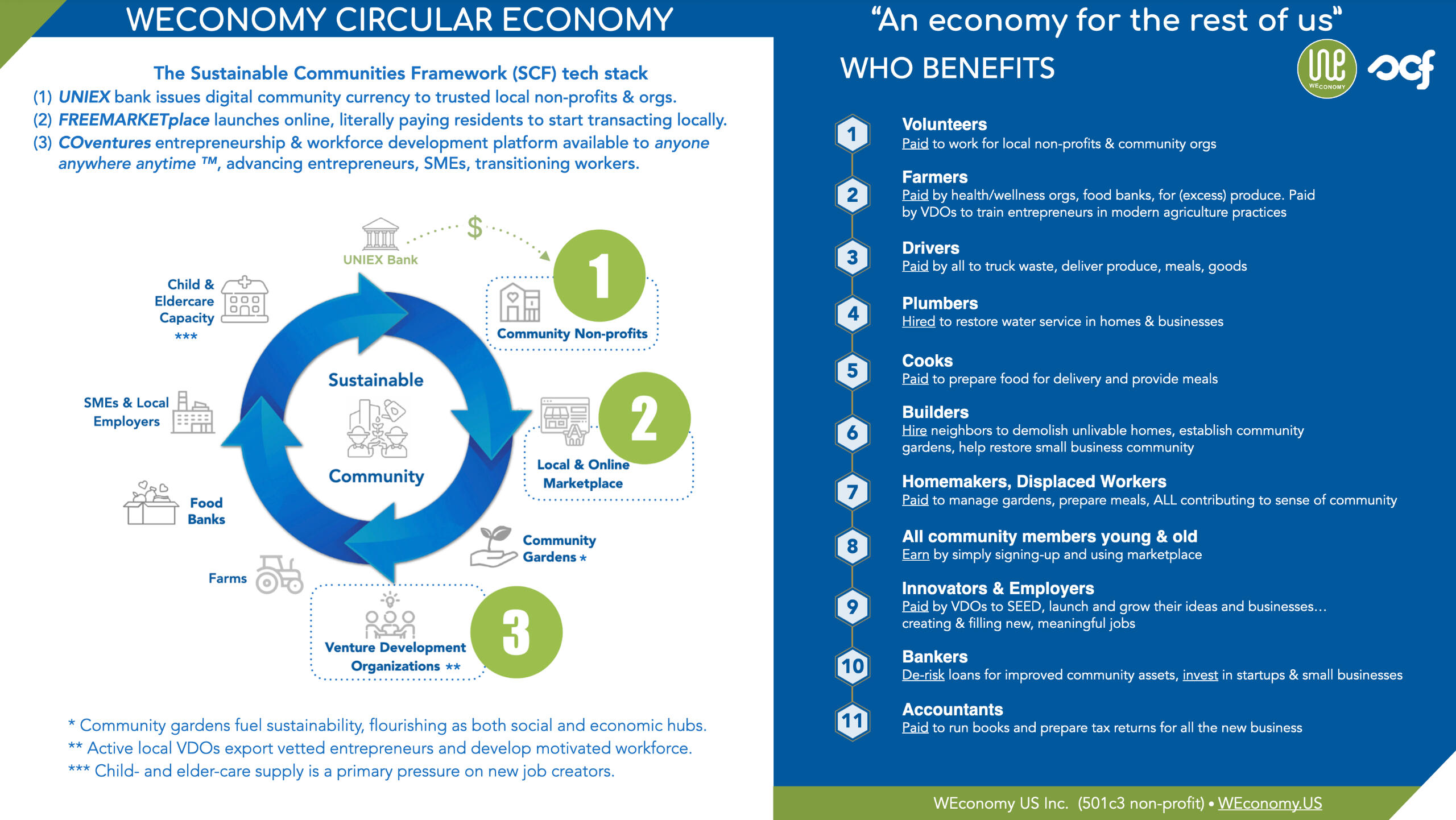A successful WEconomy is a robust, resilient local economy fueled by the power of the Sustainable Communities Framework (SCF), a new economic paradigm researched and developed by American 501c3 non-profit organization, the Sustainable Communities Foundation. The SCF provides Money, Marketplace, and Mentors, alongside the technology and strategies needed to help restore communities in crisis and build sustainable prosperity in neighborhoods anywhere.Over a decade of research yielded detailed evidence of how prosperous communities historically thrived, and continue to worldwide, without the biases, constraints and limitations of the prevailing financial system characterized by national currencies issued, with debt, by private banks, with interest.The SCF now brings historical models into modern context primarily via three breakthrough technologies: 1) a truly free digital marketplace open to all residents that literally pays its users to set up shop and transact with each other; 2) an online and physical jobs & entrepreneurship development ecosystem featuring a jobs board, business incubation and acceleration, mentoring, apprenticeships, fellowships and skills training; 3) a freely available digital community currency (a local dollar) distributed into the community by trusted local benevolent organizations providing living wages, venture grants and no-interest loans. These three primary assets, together, support regional innovation, meaningFULL employment, and ample nutrition...all leading to sustainable prosperity.Please let us know your thoughts on how it would work for you. Just email us at Prosperity@WEconomy.UsWant a bit more detail on the three M's? Here you go...1. MARKET: A truly FREEMARKETplace⢠where residents freely list their goods & services for sale & hire, for free.⢠The FREEMARKETplace will pay residents in local dollars to "hang a shingle" in the marketplace and try out the platform. If they list a product, or introduce the marketplace to othersāwe pay for that promotion too! More local commerce among regional consumers and producers helps revenue and profits stay local longerāknown as the "local multiplier effect"āleading to the creation of more community capital, shared more equitably among local stakeholdersāthat's us, the community... not just private bank shareholders.⢠The FREEMARKETplace is āBetter than Barterāā¢, not only for its convenience, like online platforms such as Facebook Marketplace or eBay or Etsy, but where the same local dollars can be used at any business wishing to attract more customers and increase their revenueāi.e., "Buy Local" campaigns. And, unlike profits at big box and chain stores where franchise fees, revenue and profits are extracted from the community to corporate banking centers domestic and abroad, WEconomy communities enjoy the local multiplier effect, circulating local dollarsātypically 4-8x further than US dollars can.2. MENTORS: A powerful Jobs & Innovation Hub, whether utilized physically or virtually, combining all the resources of an employment center and leading research university incubator.⢠Anytime you have that BIG idea, you'll now have the tools and guidance to help you take it to market. Our Entrepreneurship programs have been refined over decades, supporting aspiring entrepreneurs by providing critical resources from product development to startup launch, including mentorship, incubation, and even fundraising after you've proven your project is market-ready. Our program ensures that "when you complete, you can compete"ā¢.⢠If you already have a small business, our online āroadmapsā guide innovators and job creators in growing and testing their ideas and businesses safely before risking other people's money. And when finally ready toĀ scale and seek outside investment, we can even show you how to thank your customers mostāby sharing your success with them through Crowdfundingāturning stakeholders into shareholders of a business they already support.⢠Support from both global experts and area mentorsāthe most relevant advisor is usually still in business, and these types of mentors are motivated to perform here because a) WEconomy pays them for their service whatever amount they deem fair, plus b) they enjoy generous incentives such as choosing to exercise options to invest their earnings into early stage ventures emerging from our innovation hub, and c) a deep sense of pride and belonging helping so many local job creators follow their bliss and fortify their communities. Breaking through this common roadblock allows more talent to stay local, build legacy enterprises, generational wealth, and help their communities avoid crippling ābrain drainā.⢠Businesses founded, funded and grown locally keep more neighbors employed and keep more profits local, not sending off homegrown capital to Wall Street brokers and offshore tax havens.⢠Our Workforce development and training programs build in-demand soft-skills and relevant work experience, helping businesses avoid mis-hires which can have devastating downstream effects to both teams and a company's competitiveness.⢠All this access to local capital expands local production capacity and increases regional GDP. But Gross Domestic Product is an outdated metric out of touch with the reality of local economic conditions. The WEconomy is driven by a metric we all relate toāQuality of Life (QoL, pronounced "cool" =:-)3. MONEY: A first-ever digital community currency is used in the marketplace to pay for goods and services made or offered locally.⢠WEconomy currencies are simply a medium of exchange, on par with the US dollar, no different than things you likely use already, like grocery coupons, loyalty programs, or airline mileage awards.⢠There are over 5000 local currencies worldwideāa historic standardāstill facilitating most transactions. There are also numerous local currencies in first world economies, like this one in California, but these are 